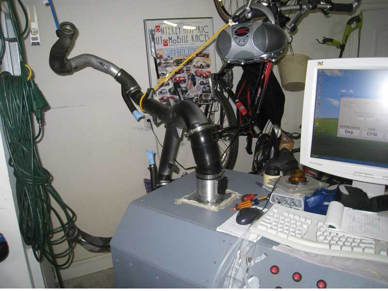 The assembled components are a bit unwieldy to mount to the flowbench, but with the help of some bungee cords I was able to get all of the piping in place.