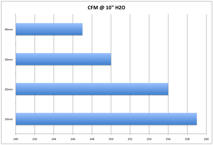The inlet was then tested for airflow quantity (CFM) at 10″ of H2O over the range of marks.