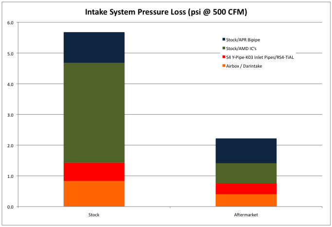 The chart below shows an approximation for how the stock B5 S4 intake system compares against an aftermarket alternative. The various system components were tested separately, so the composite results shown below do not accurately depict how all of the parts would measure if operating on the automobile.