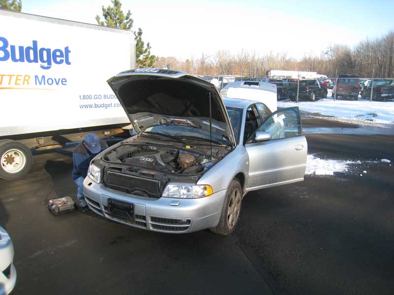The pictures provided by the auction service were not thorough enough to illustrate all of the ‘issues’ the car had, the first concern was that the front passenger tire was flat, and I had not thought to bring an air pump. No problem, I can just put the spare on. The lugs bolts were seized and it took a swift kick to the Audi lug bolt removal tool to break the lug bolts free. After all the lug bolts were removed to my surprise the wheel wouldn’t budget. I usually have my wheels coming off and going on so frequently that once the bolts are loosened the wheel practically falls off, not this one. A few swift kicks to the tire failed to cause it to budge. After some more kicks it was becoming clearer that the wheel was not going to be coming off. The tire was in pretty rough shape as it was, in fact the rear passenger tire had a bubble on the side wall, so I decided that I’d drive it as it was up onto the trailer seeing as how it was only going forward about a car length and a half.