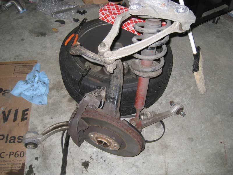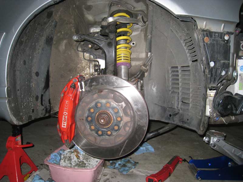 After a while I cut through and was able to proceed on. The stock components were all unhooked and set to the side. To my surprise, the stock parts were noticeably heavier than the StopTech Big Brake Kit caliper and rotors. Quite a bit so, the jumble of parts was a load to move around.