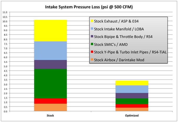 Based upon some of the latest flow testing I have updated the composite pressure drop chart. The goal of the chart is to show the relative contributions of various components to the overall pressure drop experienced pre and post turbo and help guide purchase decisions.