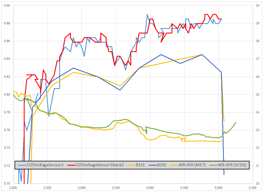 The VCDS data is B1S1 and B2S1 in the legend and also has fewer sample points on the chart. ME7Logger uses OSVoltageSensor1/2 in the legend. The wideband sensor is an Innovate LM-1 with tailpipe probe so the readings are post catalytic converter.