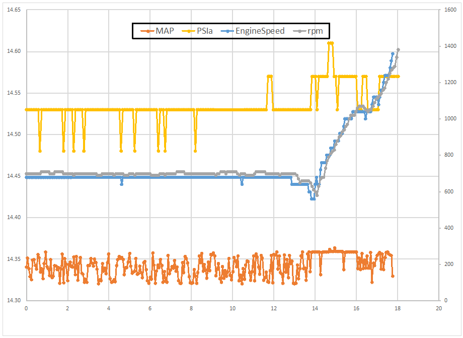 In hopes of getting some additional insight I looked at the pressure readings at idle. How much of this difference is due to pressure drop and how much to senor differences will have to wait for another event, next I’ll try logging both sensors with the engine off.