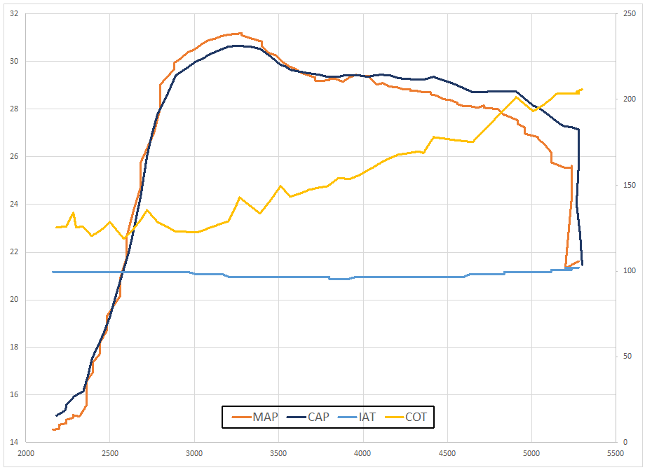 I also logged a slightly different boost profile as I work on trying to have an acceptable temporary tune on the car. This presented another opportunity to look into how the compressor absolute pressure relates to the manifold absolute pressure.