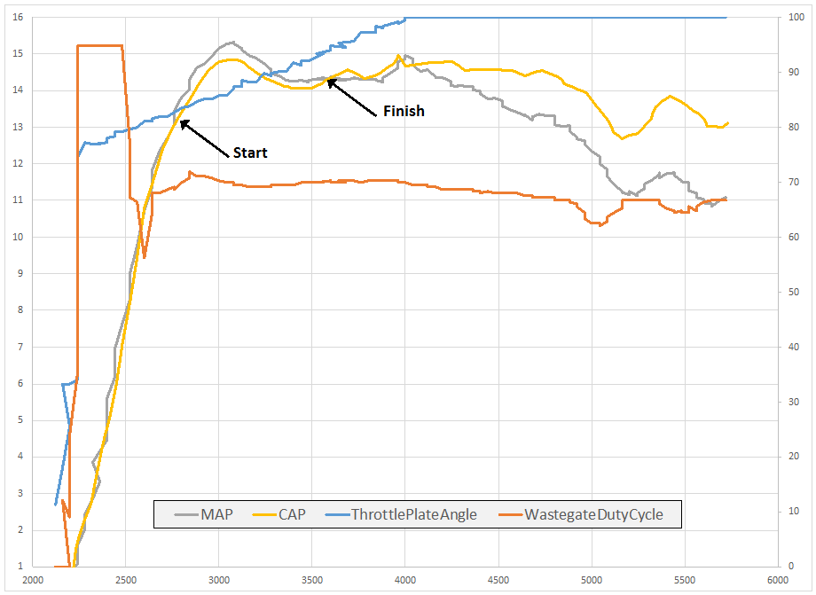 I added Throttle Plate Angle and N75 Duty Cycle to the chart with the MAP and CAP pressures to see if this theory held up. Each has a value measured as a percentage, which is shown on the scale on the right side of the chart.