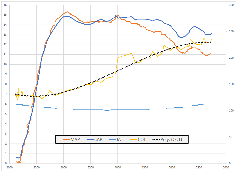 This morning I was able to log a 3rd gear pull that was not quite to redline, but far enough to show how important intercoolers are on this car. The compressor outlet temperature (COT) really climbs during a full load pull but the intake temperatures (IAT) remain close to the starting values. Temperature is on the second y-axis (right-hand side of chart).