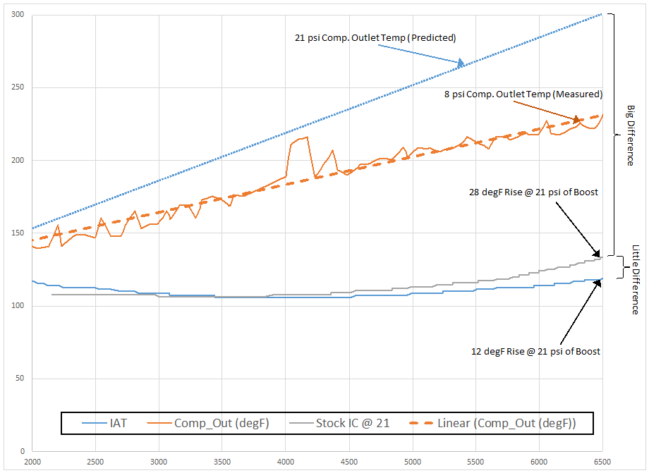 The measured compressor outlet temperature rise and IAT curve showing a 12 degF rise were recorded together on a stock boost (8 psi) pull. The curve showing a 28 degF IAT rise is from an S4 operating at 21 psi of boost pressure with stock IC’s.
