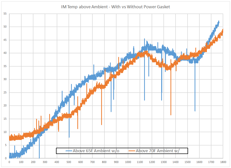 The results are unambiguous to me that the Power Gasket does little, if anything, to lower the temperature of the intake manifold at the point along the runner that I am recording temperature.
