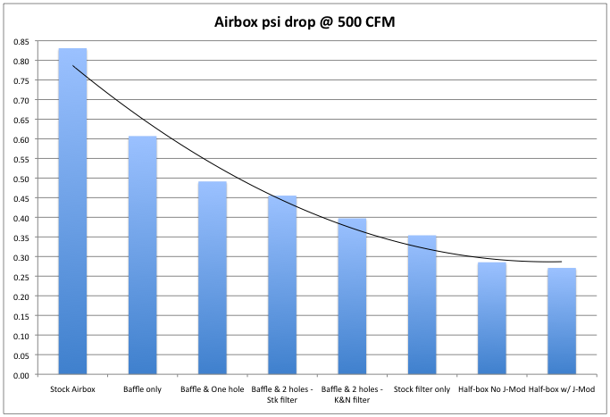 Out of curiosity I thought I’d smooth the inside edges of the airbox up near where the MAF housing fits. Smoother is better than sharp in this location so I took a file and sandpaper to the plastic and smoothed the edge out. As the flow bench testing showed, it did make a difference, but is so small (about 3/100’s of a psi) I doubt it matters – but hey it improves airflow and that’s a good enough claim for most after market performance products.
