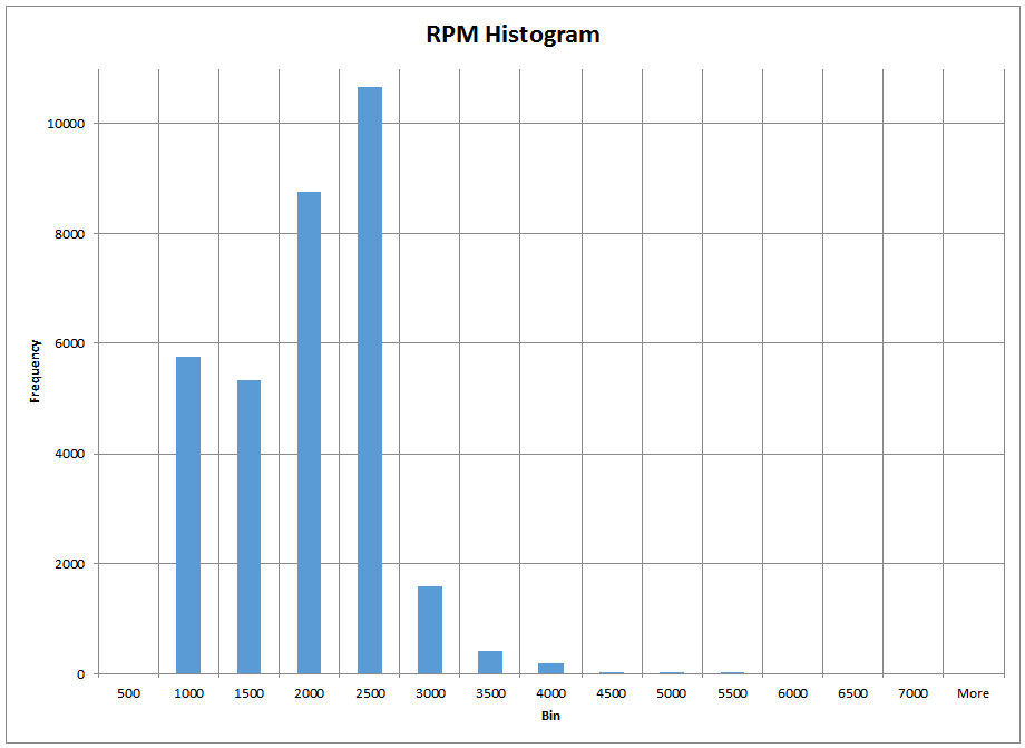 To determine where I operate the car most often during typical driving I logged rpm during a typical drive and created the histogram below to show at what RPM I most often find myself, and why I’d select a turbo that has a strength in this region.