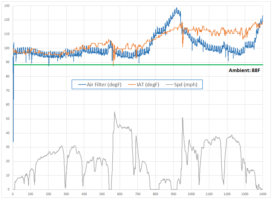 I was hopeful that once I started moving again and cooling air started to pass back through the engine compartment that the temperature inside the airbox would come down quickly. It did come down relatively fast, though I was hoping for faster. It also did not quite make it back to the starting temperature, but with a bit more driving I expect that it would have.