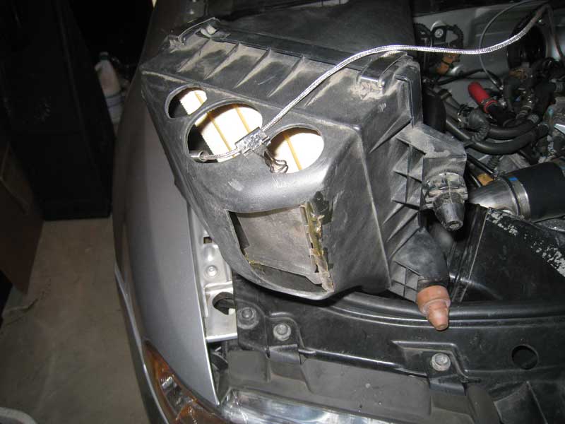 I’m curious now to know if they are letting hot air into the airbox more readily than would a closed airbox. To test this theory out I went and unmodified the bottom half of my airbox, shown below: