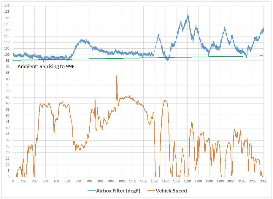 Continuing my investigation (first post here) into how the air filter temperature changes under different driving conditions I recorded my morning and afternoon commutes. Note that the temperature readings appear to drop below the ambient temperature, this is likely due to a combination of factors, such as the temperature sensor having some variation, me not monitoring the temperature on the dashboard closely, and driving through cooler pockets of air.