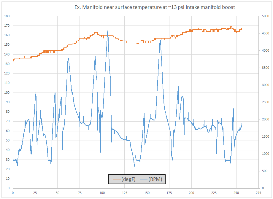 Temperature spikes in the exhaust gases during high load conditions do not register at all at the temperature probe. It is possible that during these high load conditions, where the vehicle is accelerating rapidly, that there is additional airflow through the engine compartment which can carry away the additional heat. If that were the case I would expect the exhaust manifold to remain at an elevated temperature for a short time after the high load condition, and with the vehicle decelerating the temperature at the probe to rise. Because that does not appear to happen I believe the exhaust manifold surface temperature does not fluctuate rapidly with the interior temperatures.