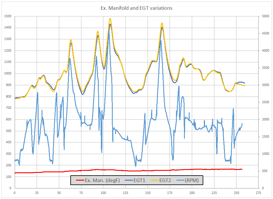 I was not expecting such cool temperatures near the exhaust manifold, cool being a relative term, but in comparison to what I have logged as exhaust gas temperatures (below) the temperature outside the manifold is not relatively high.