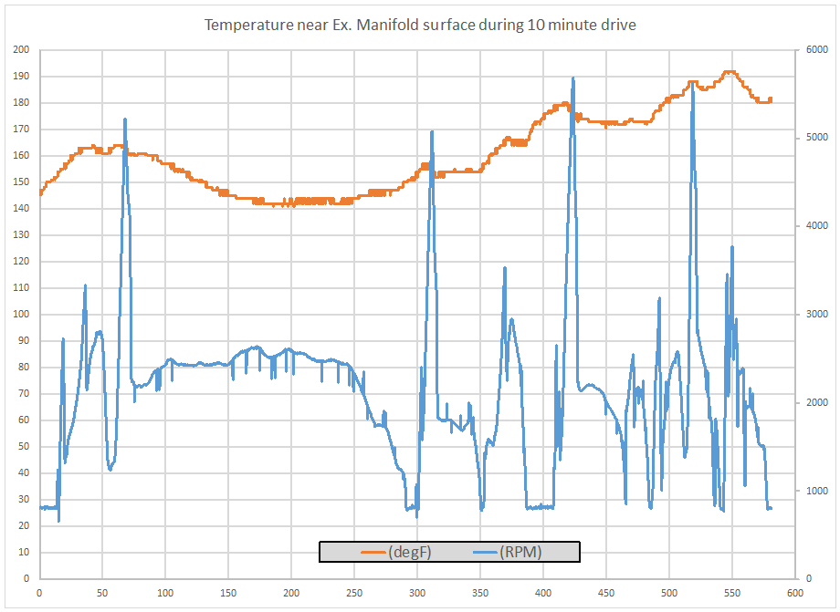 To get an idea of how much heat the exhaust manifold gives off during routine driving I placed a high temperature thermocouple close to the passenger side exhaust manifold surface.