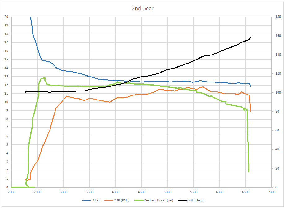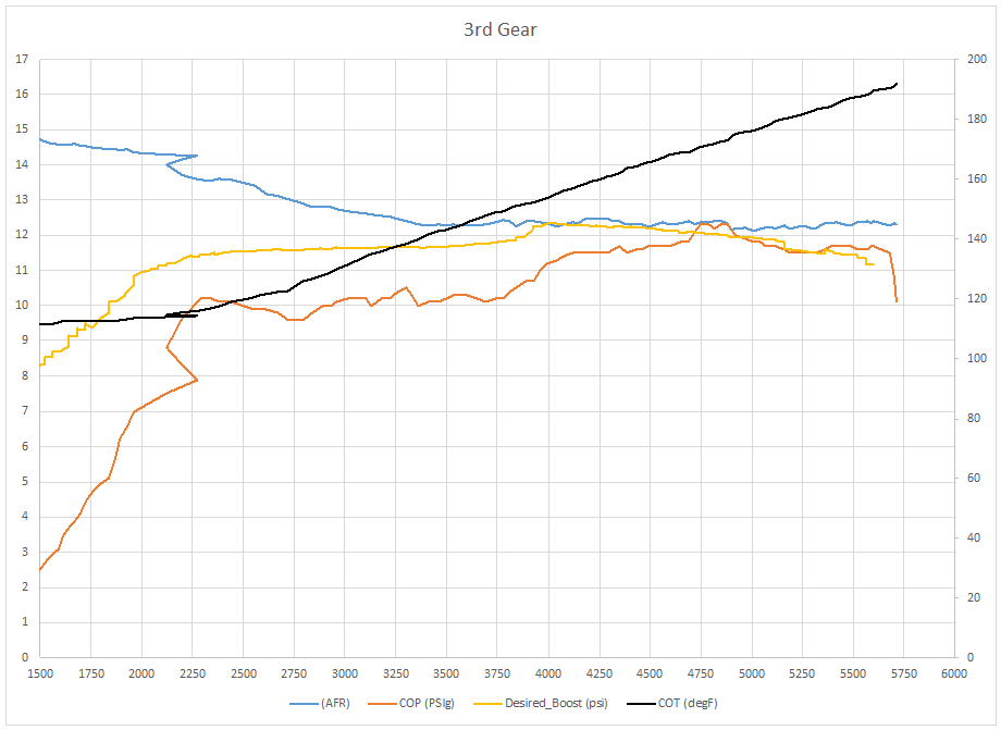 After implementing the modified boost profile. Unfortunately I was also trying to use the VisualME7Logger and managed to setup a logging config file that omitted the actual boost level from the car’s map sensor, but I did have a pressure sensor reading at the compressor housing, though it hasn’t be verified to be reading accurately yet. (COP is compressor outlet pressure, COT is compressor outlet temperature)