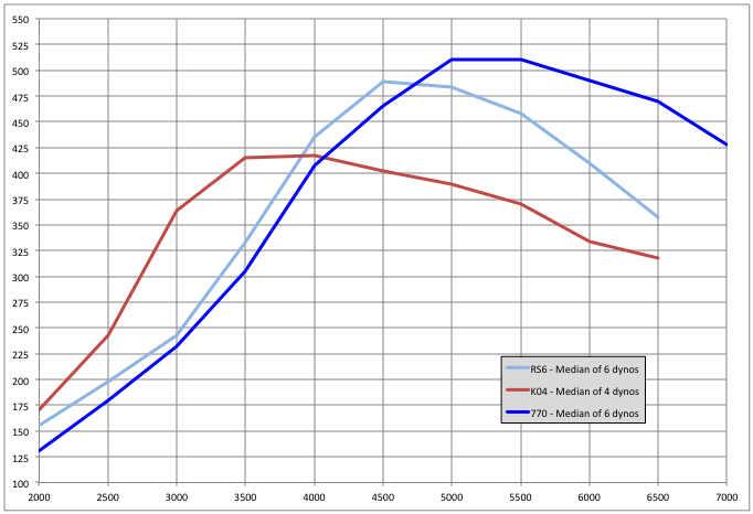This chart of torque from a number of dyno’s illustrates how different size turbochargers will delivery a different driving experience.