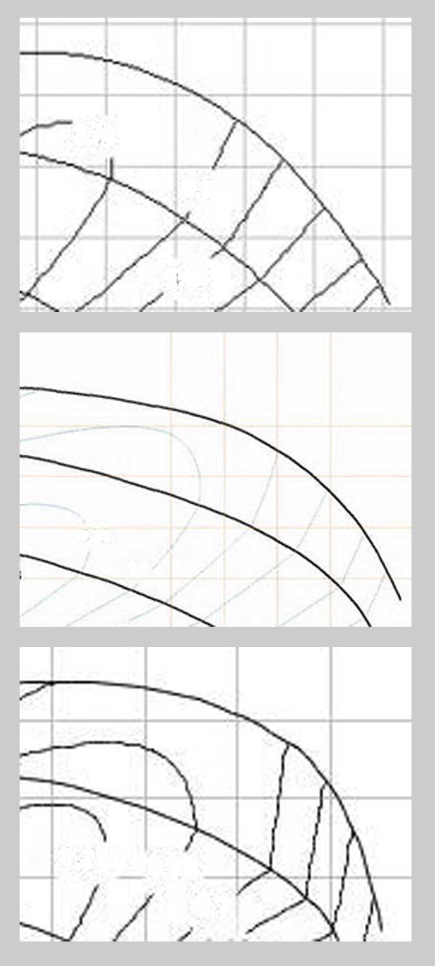 Shown above are sections of the compressor maps from three popular turbo compressors in use on the Audi B5 S4. This section is the top right corner of the map. What I am trying to illustrate is the difference between a turbocharger that dies up top, runs out of breath, and falls on its face, compared to a turbocharger that does not.