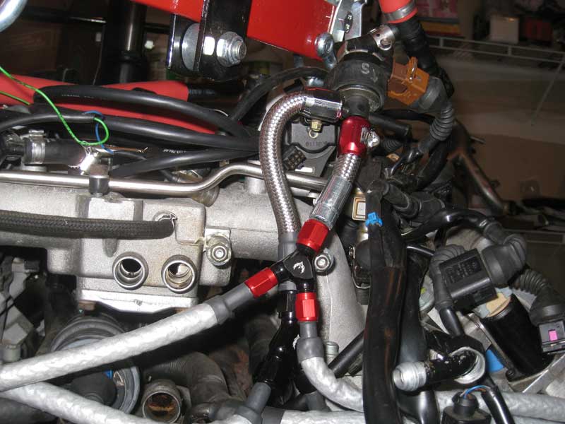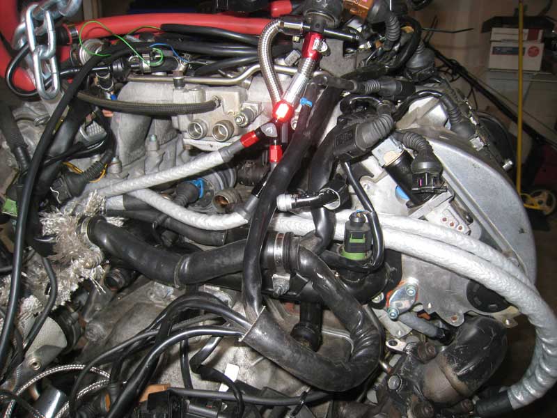 Attaching the oil supply lines to the oil distribution block was the biggest pita of the project, specifically the driver side line. The line on the driver side is just long enough to reach, but with the thickness of the stainless steel line, heat shielding, and running it adjacent to the coolant line it was a long effort to get the fitting at the oil distribution block hooked up.