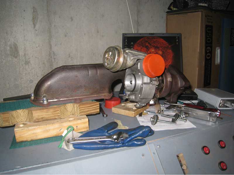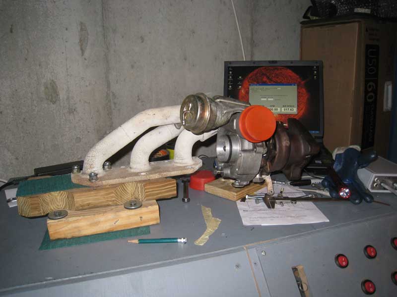 By popular request, BorgWarner K04 turbine housing attached to the stock and AWE exhaust manifold on the flowbench.