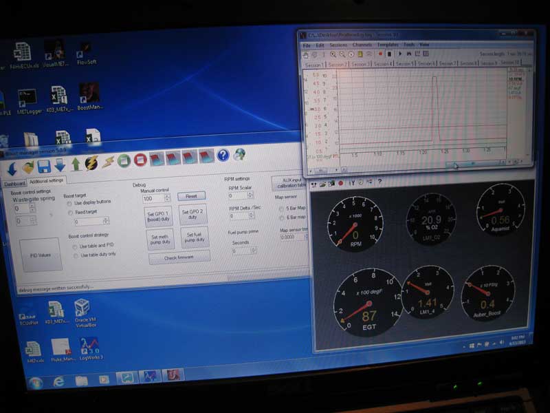 Along with the BoostManager software the data display software for the LM-1 was open to allow me to record the output voltage from the Aquamist flow sensor.