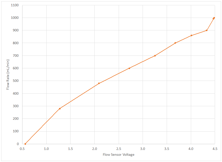 Shown below is the flow sensor output voltage for the various flow rates.