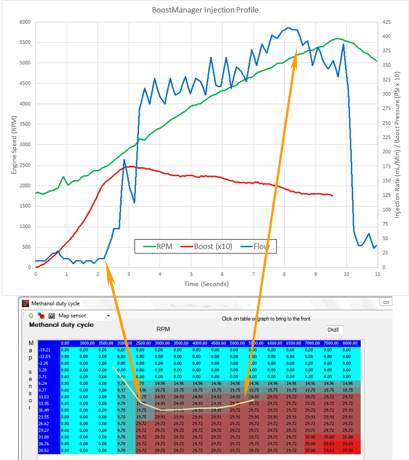 The water/methanol pump duty cycle map is based upon engine speed and manifold pressure (MAP). As is shown by the left line with arrows, activation of the pump takes place around 2000 rpm once MAP reaches about 6 psi of boost pressure.