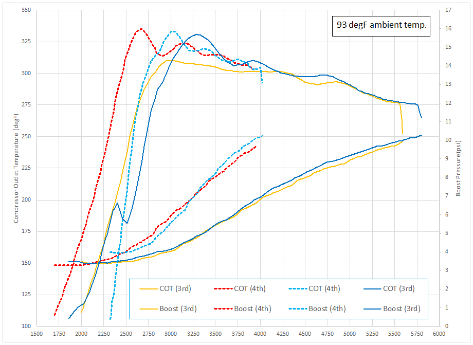 There are two measurements shown, boost pressure and temperature at the outlet of the compressor housing. Data was recorded in third gear and fourth gear, with two samples made in each gear.
