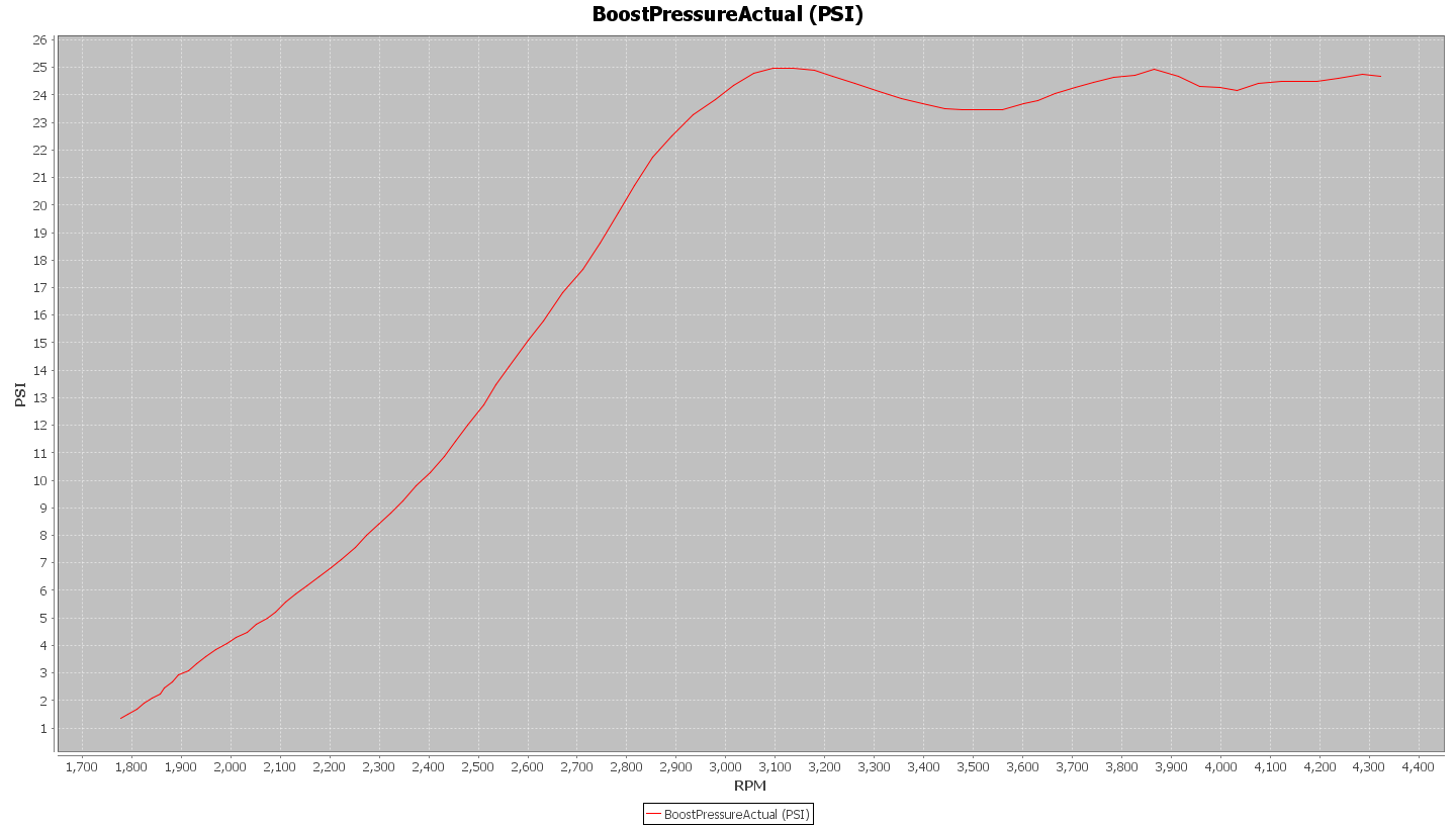 Here’s a chart showing pressure recorded right before the intercooler inlet versus the pressure recorded at the MAP sensor when using BW K04 turbochargers and the SRM Intercoolers.
