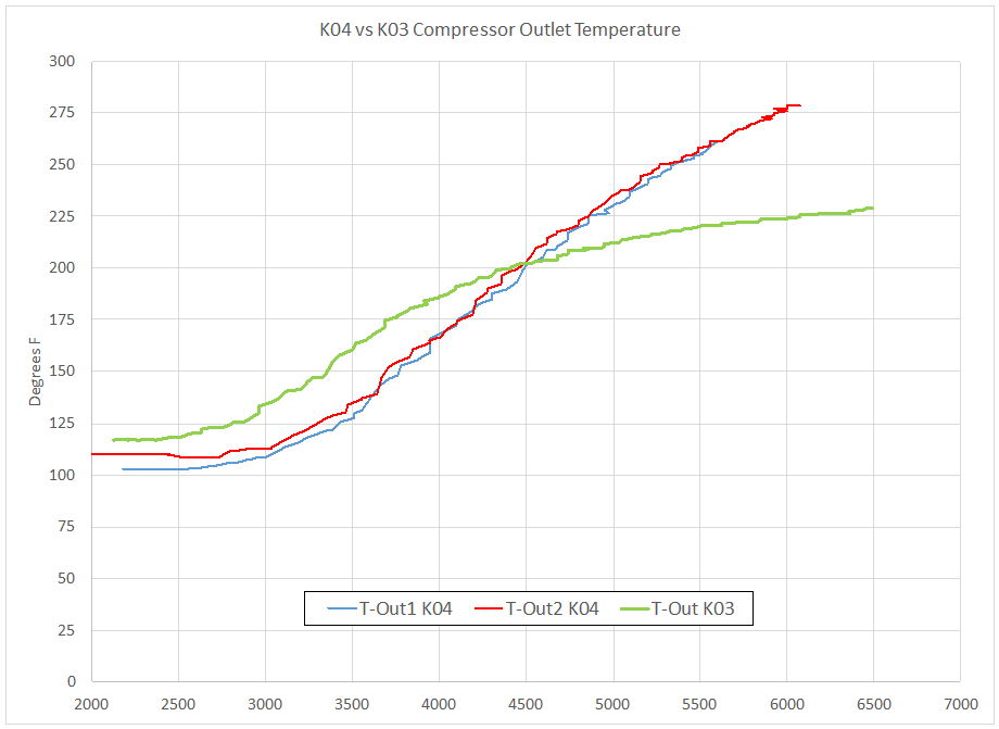 The outlet temperature of the K03 turbocharger is a good deal less than that of the K04. To me this is indicative of how important the boost level is versus the compressor efficiency when neither turbocharger is being operated at a point far outside of an efficient region of the compressor map. A K03 operating at 65% efficiency is not going to generate appreciably higher outlet temperatures when compared against a K04 operating at 70% efficiency. The K04 operating at a PR around 2.6, versus 2.2 for a K03, is more likely to generate results like those shown above.