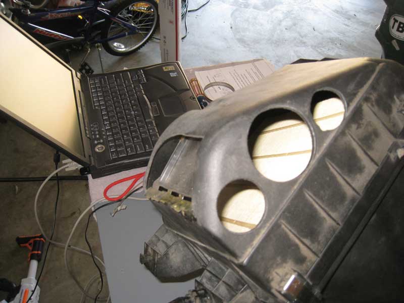I was interested in finding out how much additional airflow would be possibly through these modifications so I took a stock airbox as a baseline and recorded the airflow through it. Next I taped up all of the additional holes on my modified airbox except for the opening with the baffle. The test was repeated and then additional tests were performed incrementally opening more of the passages.
