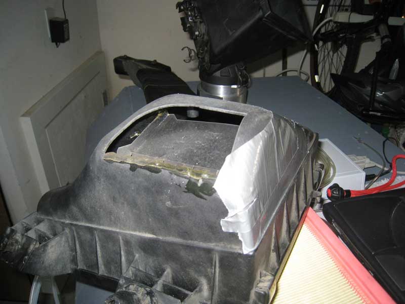 After finding that my air filter would get wet from water spraying up from the wheel well I decided to add a baffle to the opening in my airbox to prevent the entry of water into the airbox. I also added some holes to the front side of the airbox, which faces the front of the car, similar to the port located on the RS4 airbox.