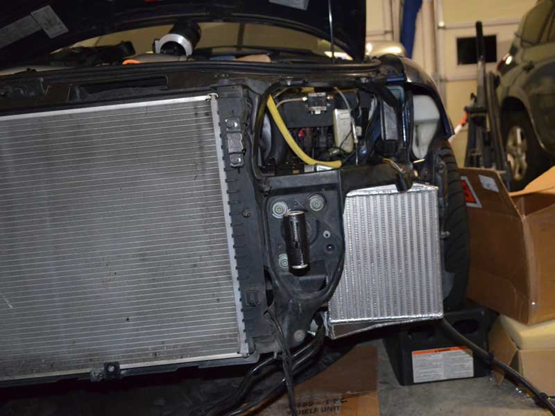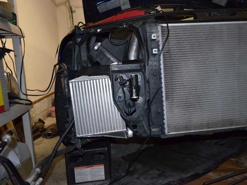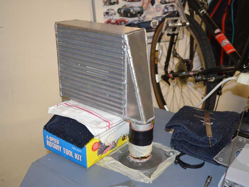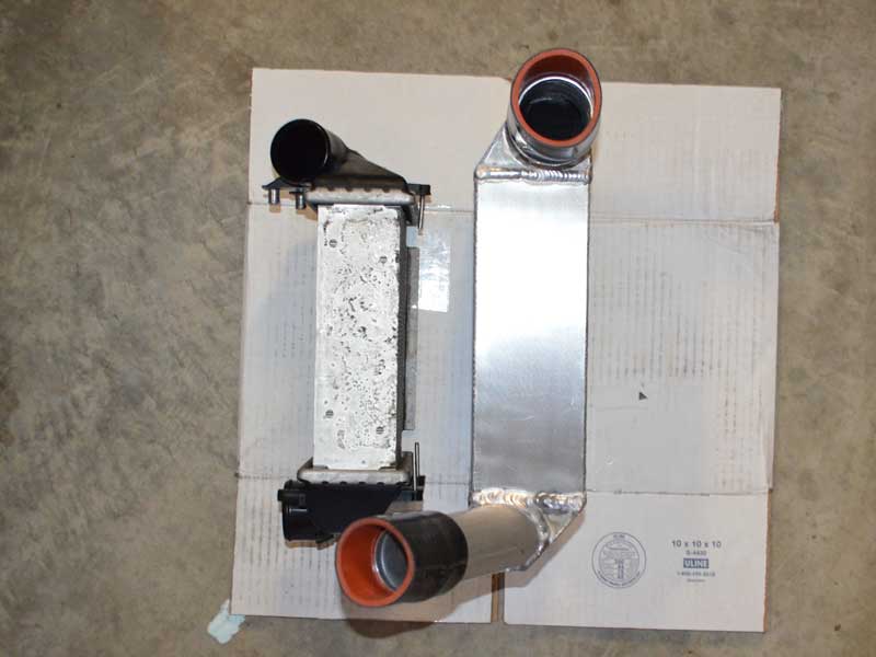 As noted in the above caption, the first test of the AMD intercooler was done with an adapter sized for the more common intercooler outlet pipes which measure 2″ in diameter. When the Apikol intercoolers became available, also 2.25″ diameter outlets, I was able to use a proper size adapter to test them, but the AMD intercoolers that were loaned for testing were already gone.