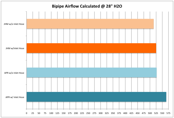 The sharper turn leading into the throttle body using the JHM stye up-pipes may be hurting the airflow slightly as compared to the APR bipipe’s more gradual curve.