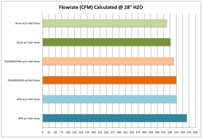 I did a comparison between the pipes and then ran the pipes through again without the inlet adapter hoses. I’ve observed that when these hoses are added often the results will change, sometimes resulting in higher airflow rates. Reviewing flow bench tests done by others it is clear that the inlet shape is an important component and ideally the entry would be a smooth, bell-mouth shape. Trying to construct multiple bell-mouth adapters for the various configurations that I am testing would be more trouble than I want to go through, so my procedure is to keep a standard inlet for the comparisons. I do this accepting that the inlets may be less than ideal, but hopefully the standardizing of inlet type will still produce valid results between items, if less than would be achieved using a better designed inlet.