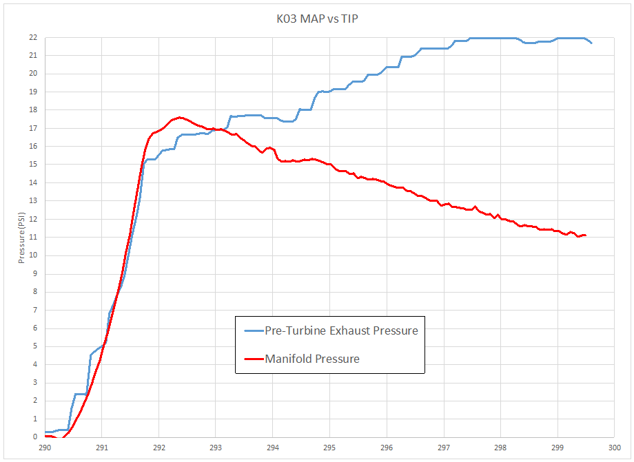 Here is a comparison of the manifold pressure on K03’s with a Stage 2 tune versus the exhaust pressure just prior to the turbocharger turbine inlet.