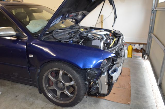 I started pulling some stuff out of the engine compartment so I could get a better look at the frame, looking at the front the frame rails that the engine sits between I could see they were slightly bent, which was not good. An option that I considered pursuing was to buy my car back and then use the payoff amount to purchase another used S4. I could then swap over all my aftermarket parts as well as the motor and anything else I like, that way I could get a higher mileage car cheaply but put a lower mileage motor in it. Once the current car had all the useful parts removed or sold I could then sell the remainder to a salvage yard. Another thing I could do would be to hang onto the extra motor to rebuild with some better internal components.