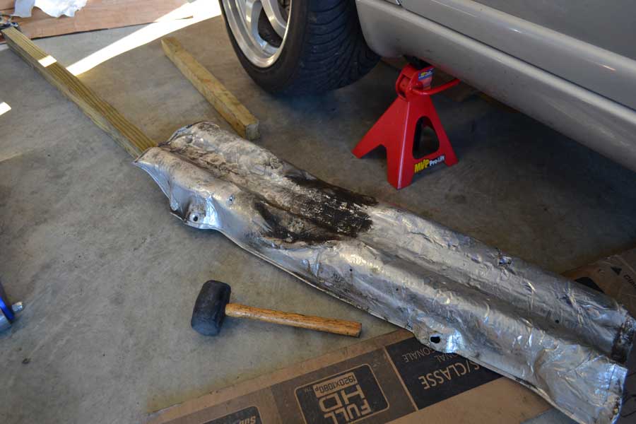 I took a hammer and started strategically creating flat spots so that the driveshaft and the exhaust pipe each had some space with clearance to sit within.  I still need to do a test drive to ensure the driveshaft doesn’t rub anything. When I pressed on the heat shield I was getting movement of the heat shield where if it were too close to the driveshaft I’d have expected that there wouldn’t be any movement.  Hopefully that’s a good sign that the clearance is sufficient.