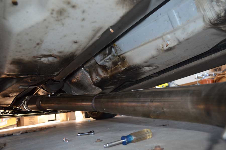 With the single piece driveshaft and 3.5″ single exhaust I was finding that the heat shield between the exhaust and driveshaft was in contact with the exhaust, the space is tight between those two main components.