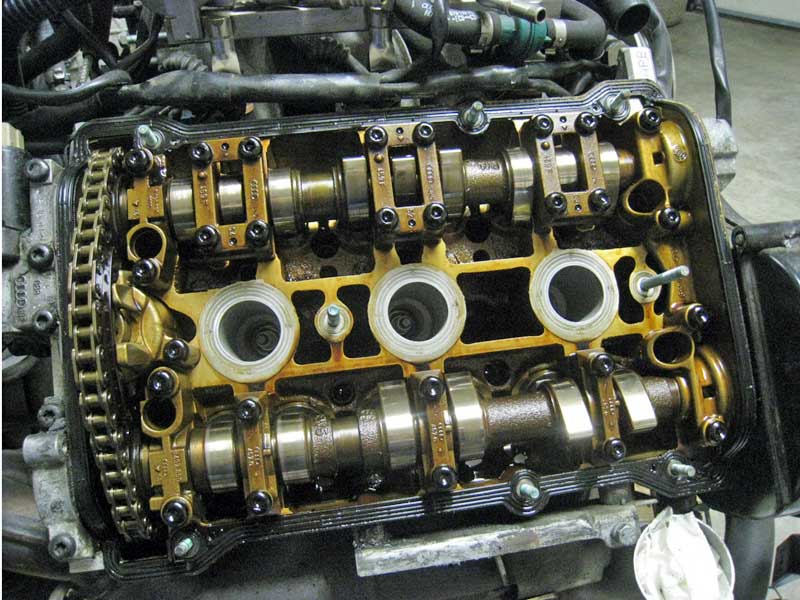 After finishing the timing belt and water pump I moved onto the valve cover gaskets, cam chain tensioner seals, and cam plugs. What would this job be without a specialty tool, one which I did not have. Luckily another local S4 owner had the special tool and I was able to borrow it. This was my first time doing this job and I encountered some difficulty with the cam chain tensioner. First was getting the tool properly in place so that the tensioner could be raised far enough to remove the gasket and clean underneath – and this was on the passenger side, with the motor out of the car. By the way the passenger side is the easier of the two sides. On the drivers side the cam tensioner is sort of stuck in place because the timing belt shield goes right over it. Neither DIY write up I had said anything about this so I had to do some more digging around. One shop said to remove the bolts (3) that hold the shield in place and bend it out some. I tried that but it didn’t seem to improve the situation all that much. Another tip was to turn the crank a little which would allow the tensioner to raise further. I suppose that helped, but it was still very tight trying to get under there. I was finally able to get the gasket out but cleaning underneath there was hard.