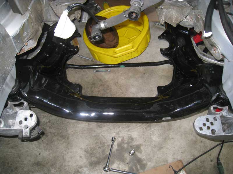 The Silver car’s subframe had some spots of corrosion and rust on it and I wanted to try and take care of them while the motor was out of the car. At first I was going to try and clean up the rust with the subframe in place but that began to look like a messy job that would not be done all that well. If the subframe were out of the car I’d be able to get to all the spots I needed and not have any parts of the vehicle impeding my access. I decided that with everything else that was already off of the car taking the subframe out as well wouldn’t be much more work, so that’s what I did.