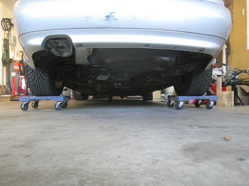 I was relieved when I lowered the car down with a jack onto the first dolly and it held without making a sound. Dolly two was put in place and then after placing the car into neutral I was able to swing the rear end around. I’d already pointed the front end into the corner on the right side of the garage just pushing the car and turning the wheel.