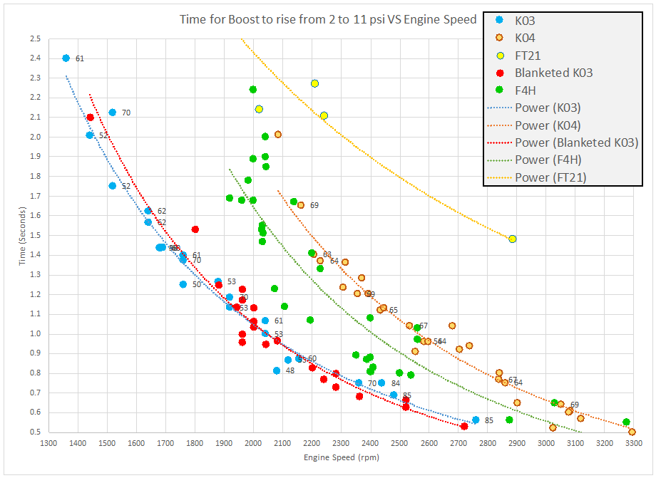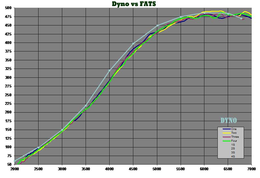 In the chart below the light blue line is what was recorded on the dyno (shown further down the page), and the other colored lines were FATS pulls of 2.69-2.71 seconds.