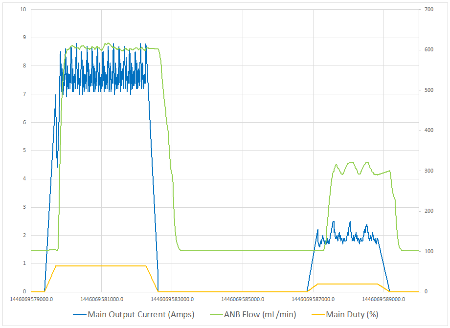 As can be seen, a moment after the current increases the water-methanol flow rate also increases, what I was expecting to see with a properly setup system.