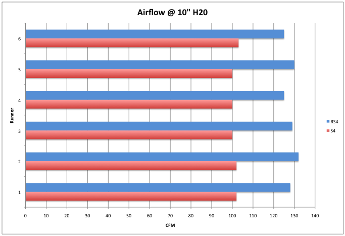 Not too surprisingly the RS4 intake manifold flowed on average 27% more than the S4 intake manifold based on measurements taken at 10″ of H2O.