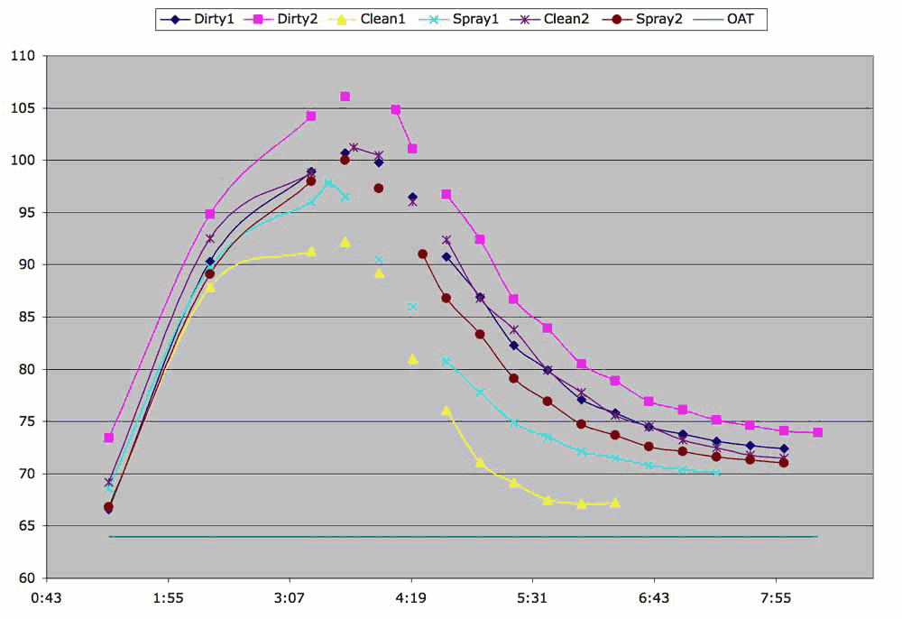 There appears to be a reasonable likelihood that the cleaned intercooler operates more efficiently than the IC that was allowed to accumulate dirt for 4.5 years. Whether or not it is worth the effort to remove the intercoolers from the car to clean them, a large job for sure, for a three-degree benefit, is the question to be asked if one is considering cleaning their intercoolers.