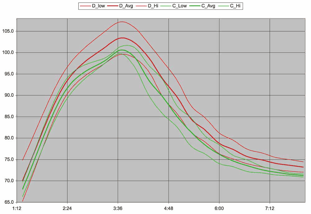 The charts below show the results of the six tests with the outside air temperature plotted at 64F.