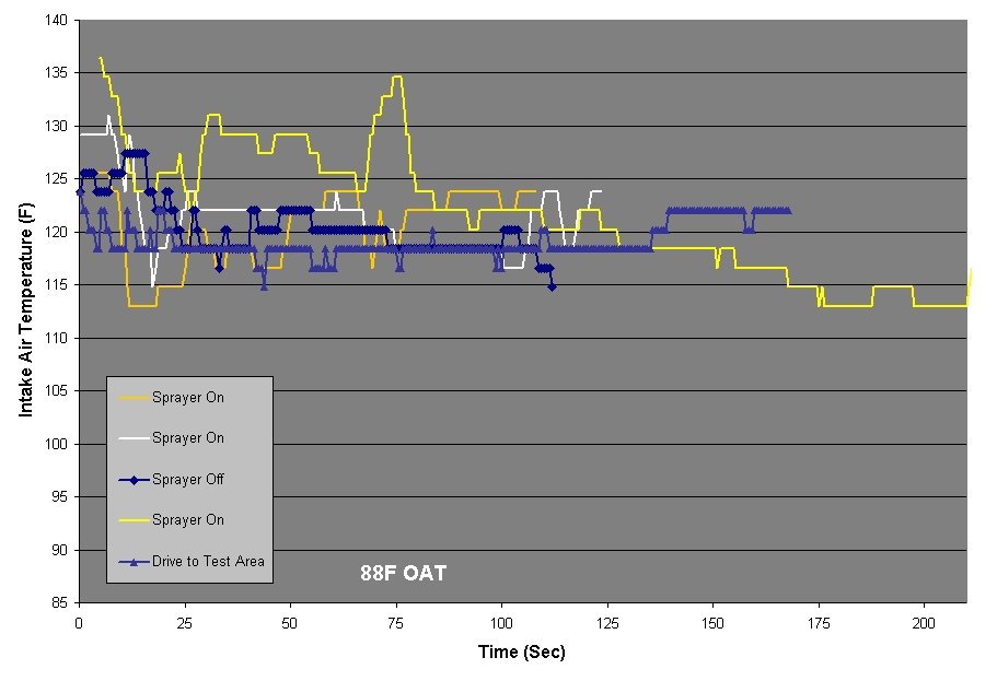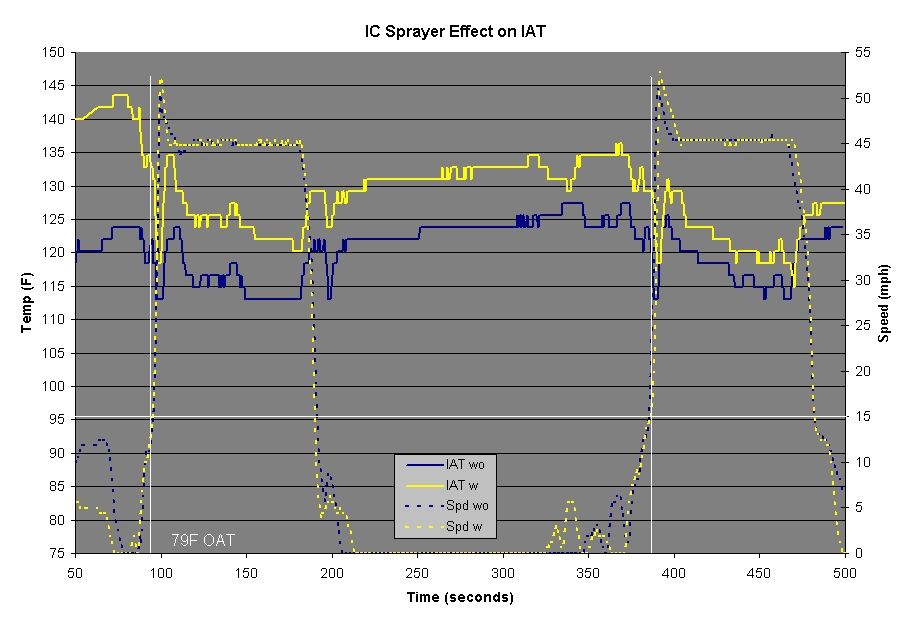 In both tests the results were unexpected. There was no discernable benefit to using the IC sprayer as measured by the intake air temperature. One possible explanation I can come up with is that the intake air temperature is a function of the entire intake system. This includes the air box, maf housing, Y-pipe, turbo inlet pipes, turbocharger, turbo outlet pipes, IC, Bipipe, and intake manifold. Despite the intercooler possibly cooling faster with the IC sprayer in use, the overall impact on the intake air temperature was limited.